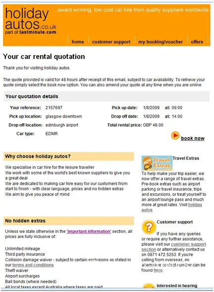 If you look at the pic of my recent quote from this company, a couple of things stand out. Total Rental Price is GBP 46.00 and "No Hidden Extras". Surprise, surprise on triple -checking it turns out that they were planning to levy an additional GBP 35 because it is a one-way rental. Now it states right thre on the quote that this is a one-way rental, and that the TOTAL price will be GBP 46.
