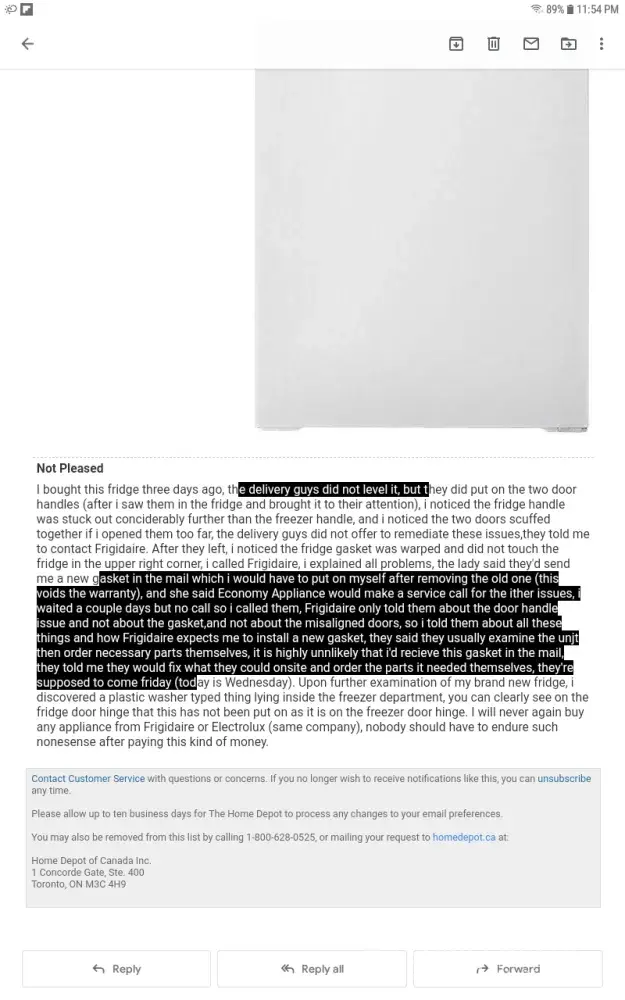 frigidaire fridge delivery and customer review censorship
