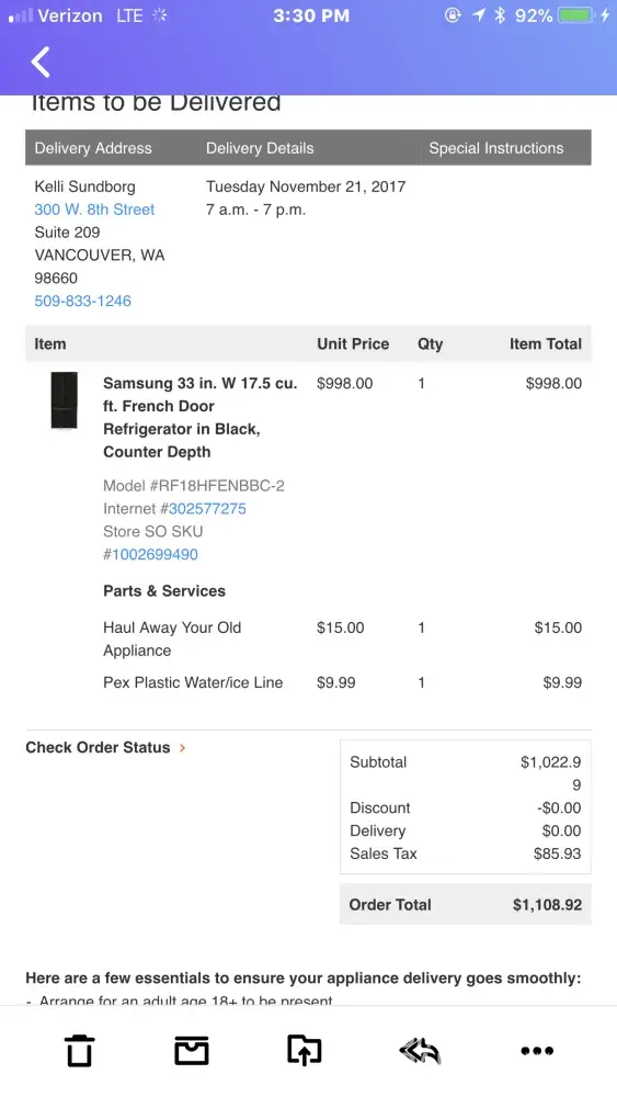 PS. On Wednesday November 22, 2017, received a call from Home Depot, not only was the new washer not going to be delivered. but it appears that it was delivered somewhere else and they were attempting to find it, someone will get back to me. The comedy of errors continue.
