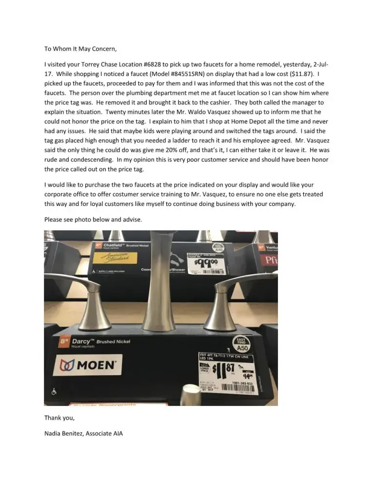 I would like to purchase the two faucets at the price indicated on your display and would like your corporate office to offer costumer service training to Mr. Vasquez, to ensure no one else gets treated this way and for loyal customers like myself to continue doing business with your company.