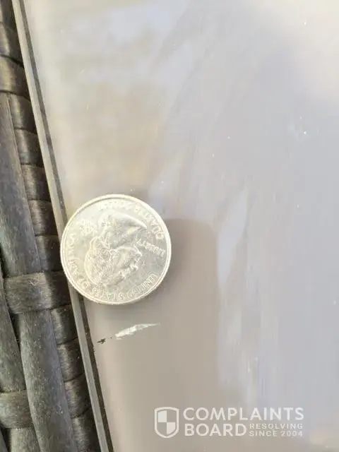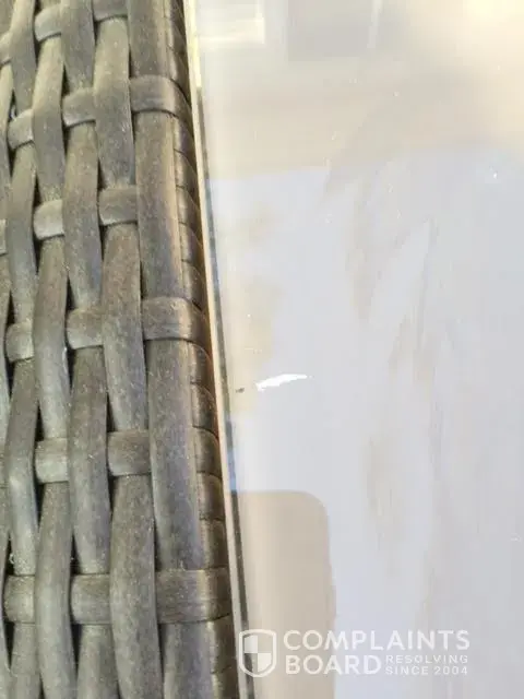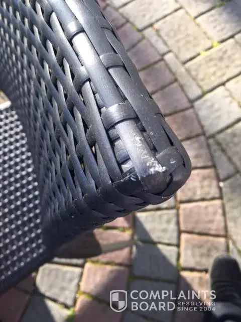 The table had a piece of film missing and they put a piece of tape over it but it should have been exchanged for a new table top. We purchased it new and it came in like a second hand piece. Home Depot's solution was to send us paint to fix the problem. Two of the chairs had damage on them and again the solution was to send paint.