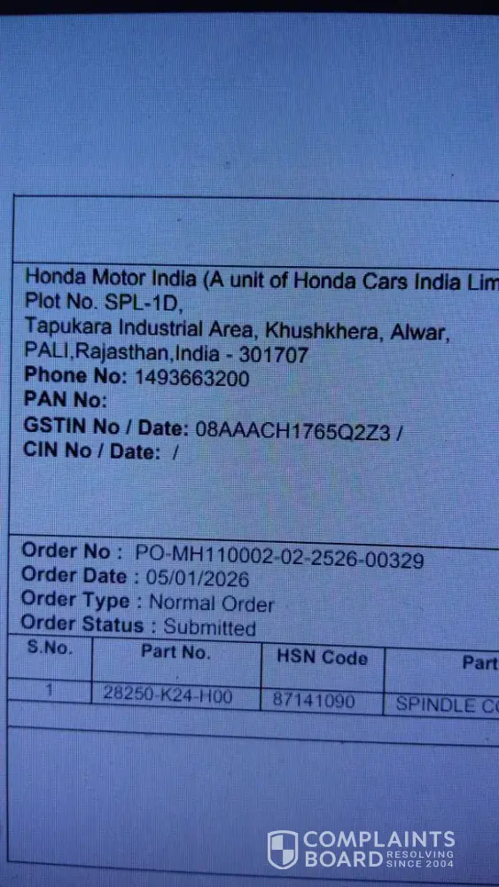 I am attaching a written order document from the Aster Honda showroom and a photo of the parts as proof of when the parts were ordered.
