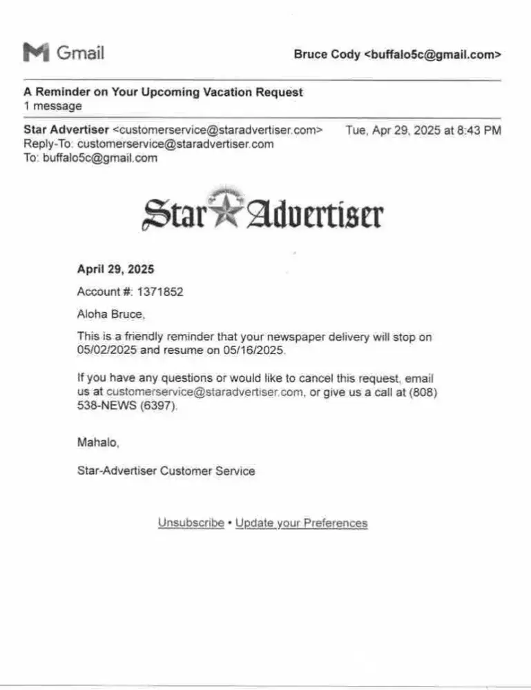 Honolulu Star-Advertiser Vacation hold