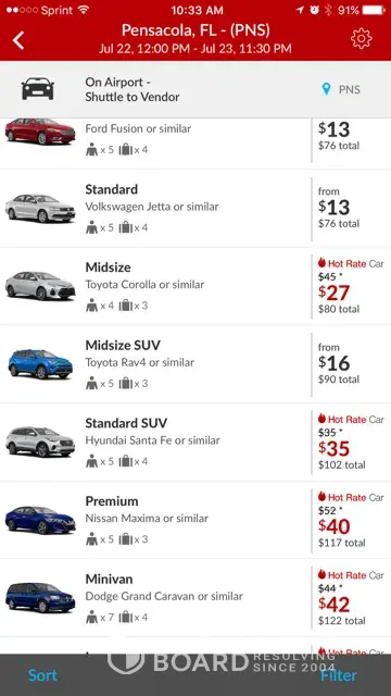 Hotwire Car rental on mobile app