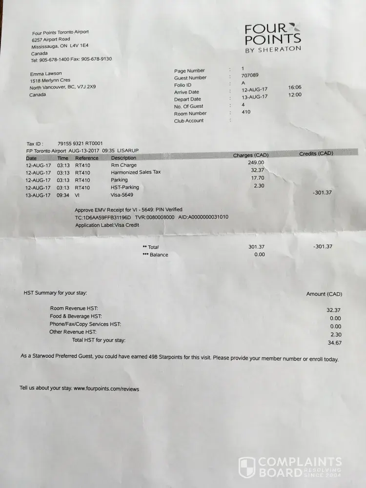 booked a room on 8/12/17 through hot wire got a room at the hyatt regency pittsburgh hot wire website said free parking and breakfast which this location had neither i had to pay to park and no breakfast unless paid for. that is false advertisement and would like a free room or my money back. how do i go about resolving this situation i will not put my credit card info on here for them to search my record