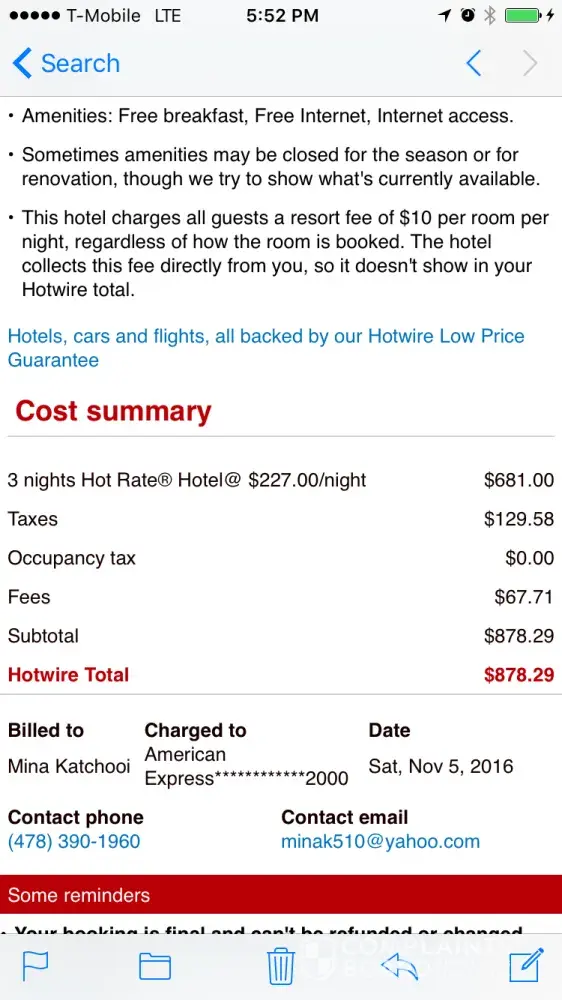I booked a hotel room for 3 days at Rodeway Inn in Colorado Springs, Colorado. I paid for the room right away and received an itinerary. Hotwire failed to inform me that the hotel had a $ 25 a night pet cleaning fee. I found out about it when I arrived to check in. So the bargain room of $45 a night was now costing me $ 70 a night, which the hotel was not worth. Be aware that Hotwire will tack on extra charges and not inform the consumer. Makes you wonder how long they've gotten away with this scam.