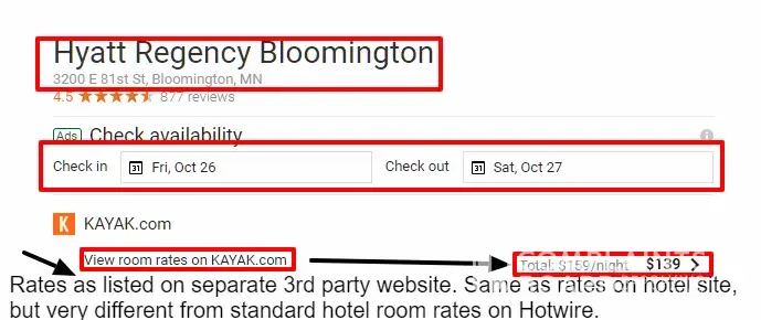 After discovering the falsified distance, I immediately navigated to Hyatt's official website and found the standard average weekend room rate of $129 - which is EXTREMELY cheaper than the falsified listed standard rate of $237 by Hotwire. In fact, I only saved $26 over Hyatt's given rate - and ended up paying more overall by using Hotwire after fees were included.