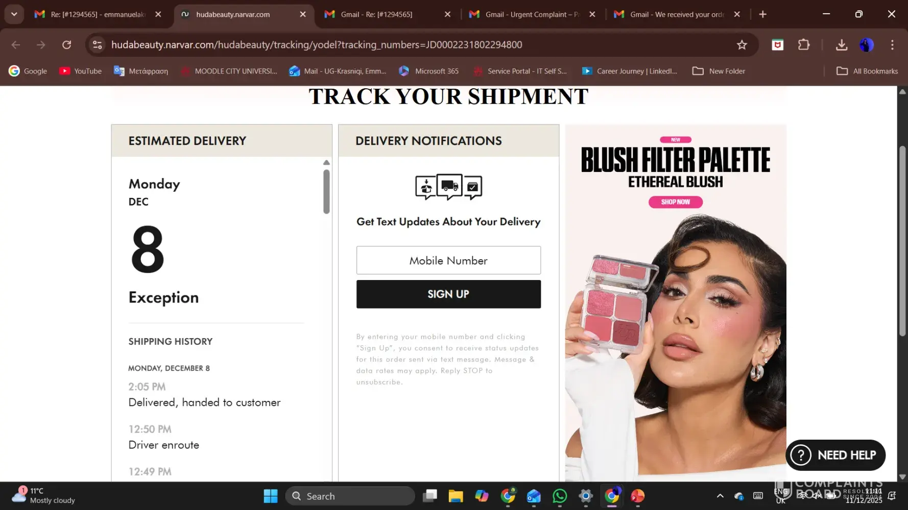 Dear Huda Beauty Customer Support, I am writing again regarding my order UK04004353, placed on 23 November 2025. Despite being marked as fulfilled on 2 December and later marked as delivered on 8 December, I have not received my package. The courier, Yodel, has now confirmed that the parcel is being returned to the sender, even though your system...