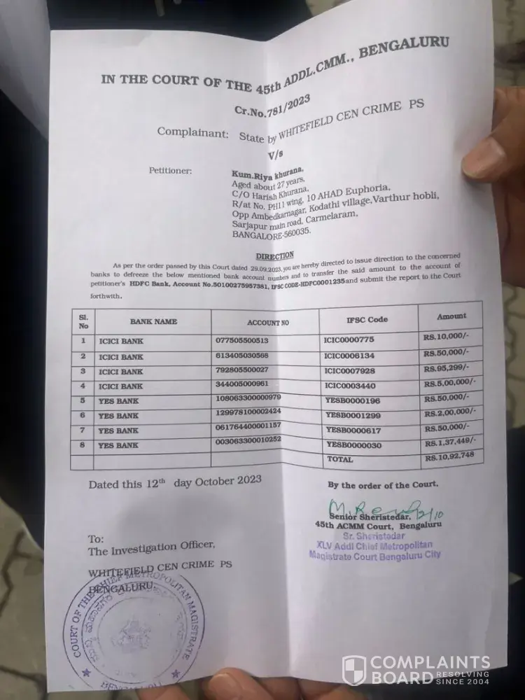 ICICI BANK IGNORING COURT ORDER FOR 26+ MONTHS I am a cyber fraud victim who lost Rs 17.8 lakhs in June 2023. After filing FIR No. 0781/2023 at Whitefield CEN Crime PS Bangalore, I obtained a court order on 12th October 2023 from 45th ACMM Court, Bangalore (Cr.No.781/2023). COURT ORDER CLEARLY DIRECTS: ICICI Bank to defreeze and transfer Rs 6,55,298 from...