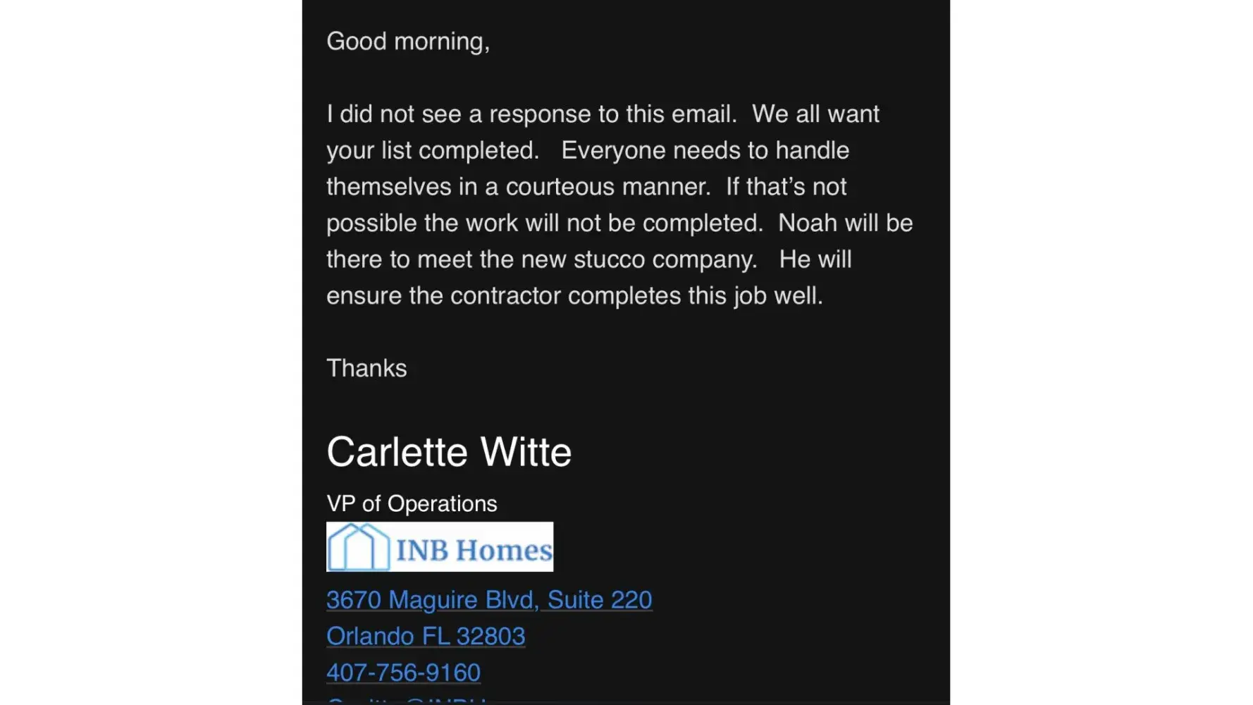 We’ve texted and emailed numerous people from INB Homes for a week and all of our messages have gone unanswered and ignored. Is this the respect you’re speaking about Carlette and Mark? Cause we don’t feel very respected and haven’t since day, Yet YOU are the ones who demanded respect from YOUR customers? You have no business talking about respect from your CUSTOMERS when every single one of your customers I’ve spoken to doesn’t have one good thing to say about INB Homes.