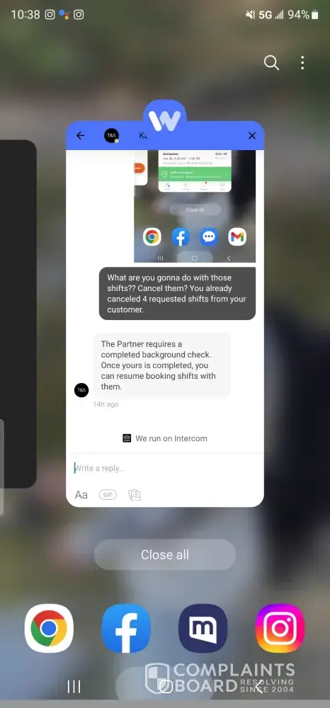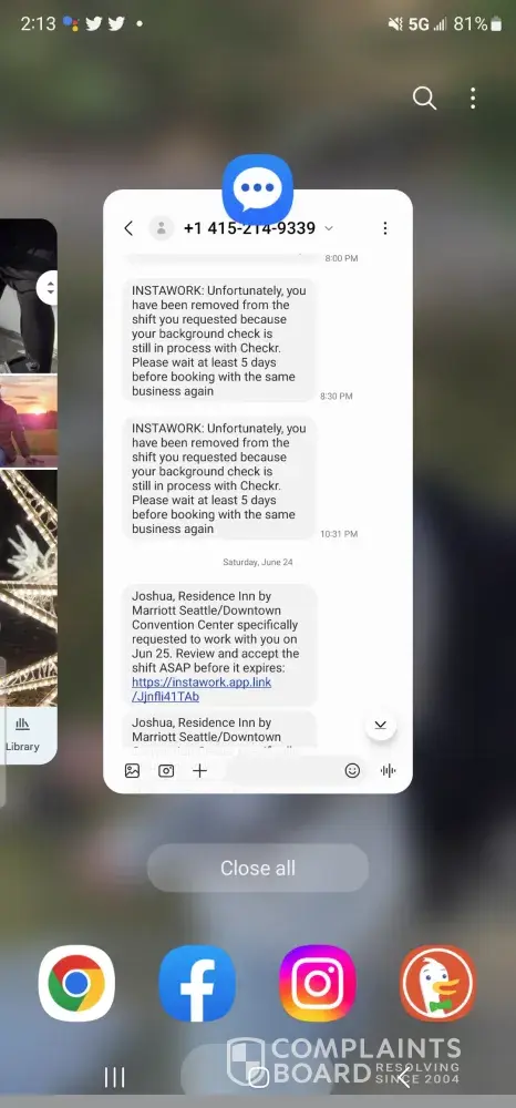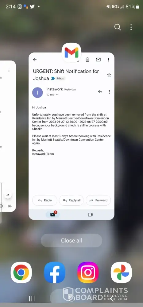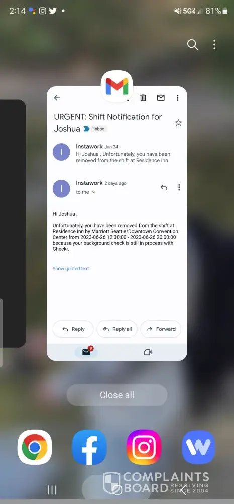 The following morning I was suspended by Instawork because, according to them, I was a no show.