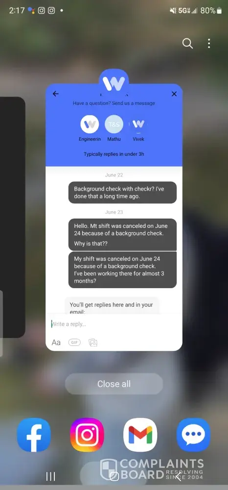 I've sent several messages trying to get some understanding of what's going on with my account as I book shifts. But when I do book a shift I get removed hours later because it says my background check hasn't processed but whole time it's in my email and instawork has a copy. So I arrive to my shift and that's when I get removed or canceled on but the job...