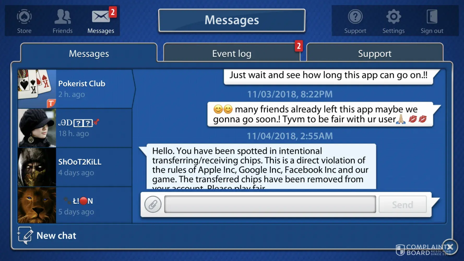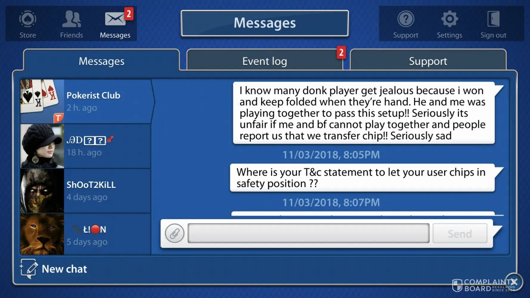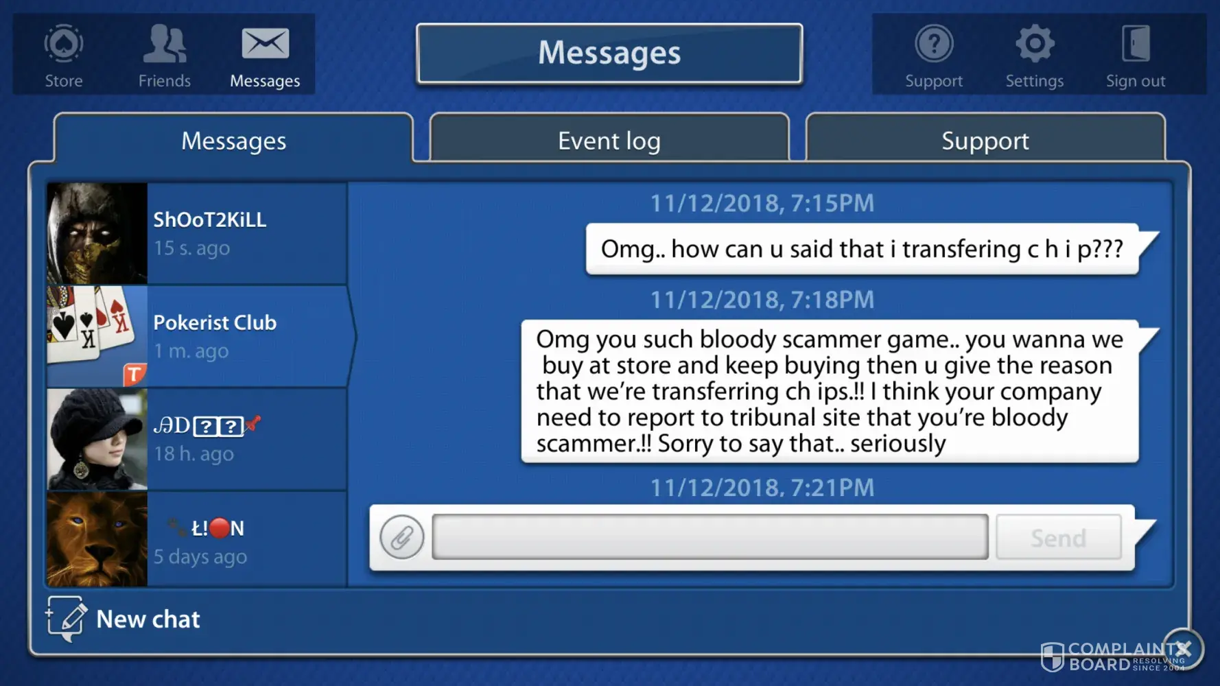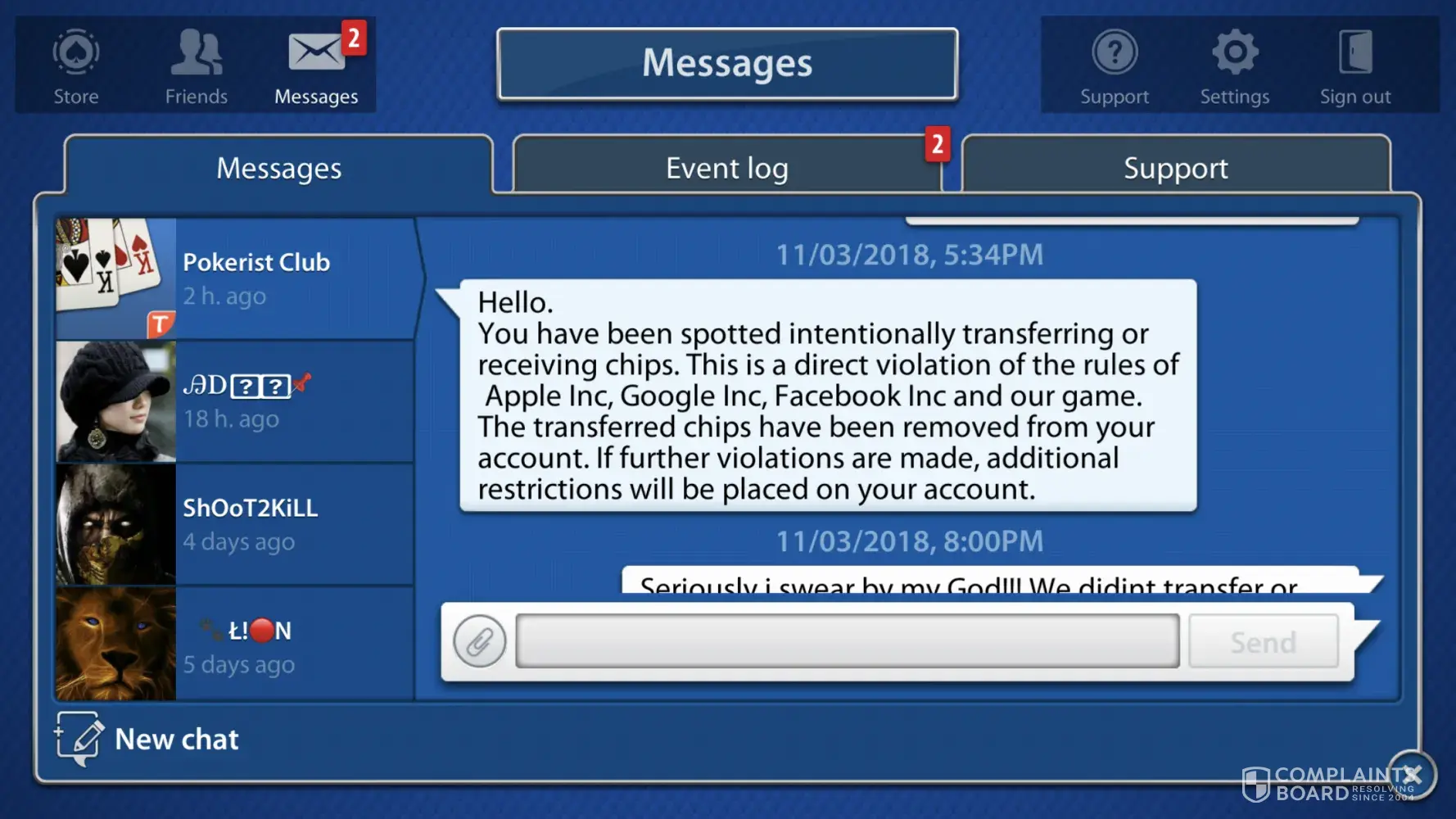 They keep taking my chips and told me that I have been spotted transferring chips!!! Seriously many time happened and I feel sooo disappointed and seriously they're bloody scammer game site.!! They didn't provide fair games as they're certification has been mentioned.!!! They're bloody cheater actually and pretend they are right!! They took all my chip...