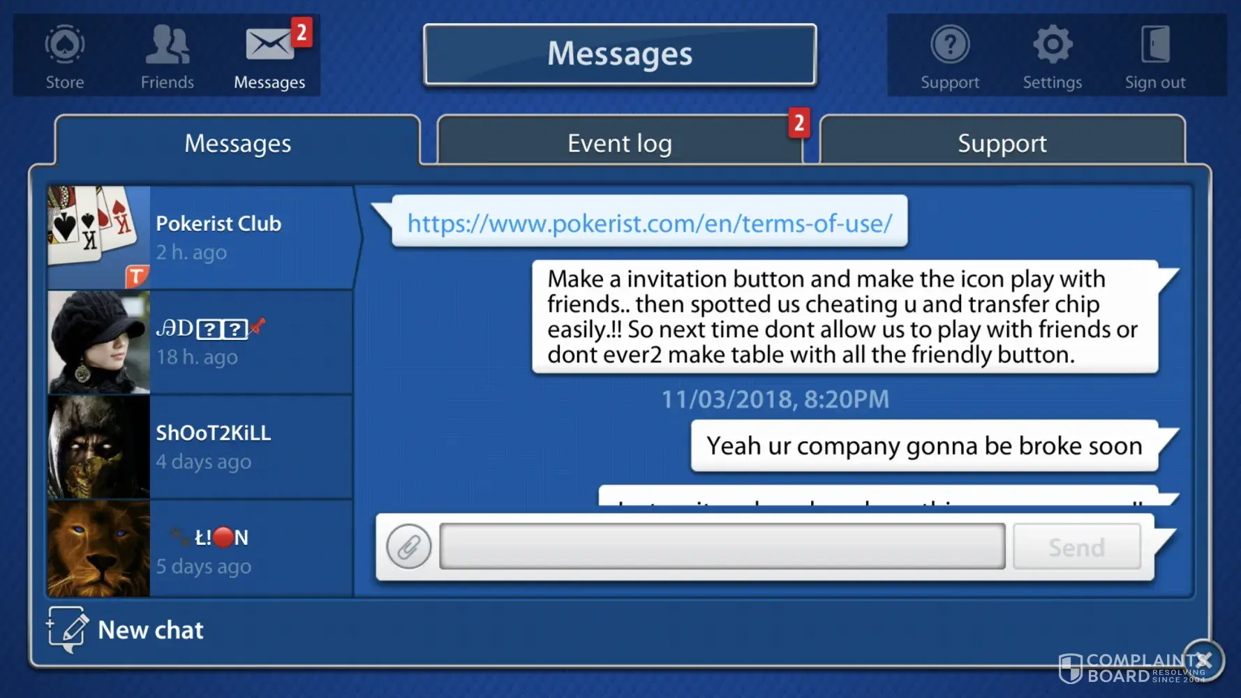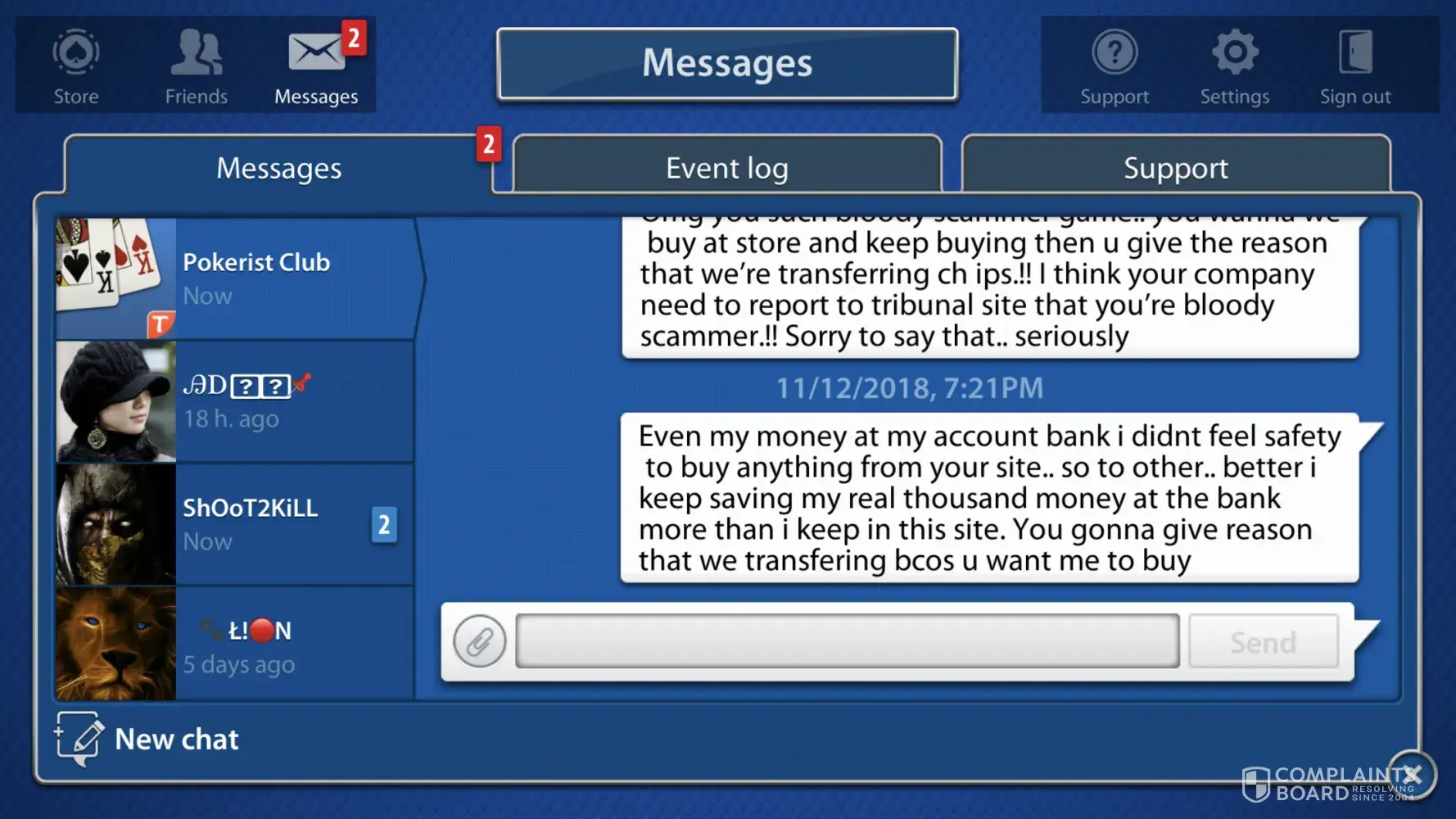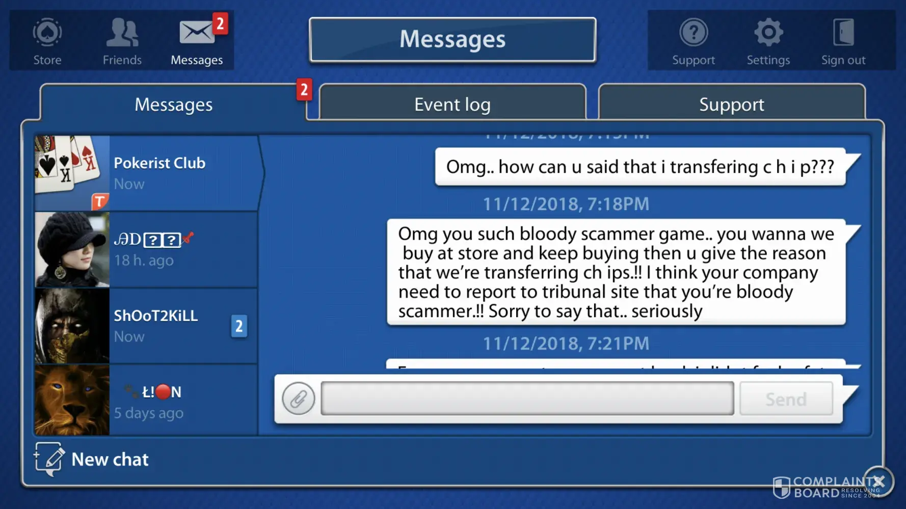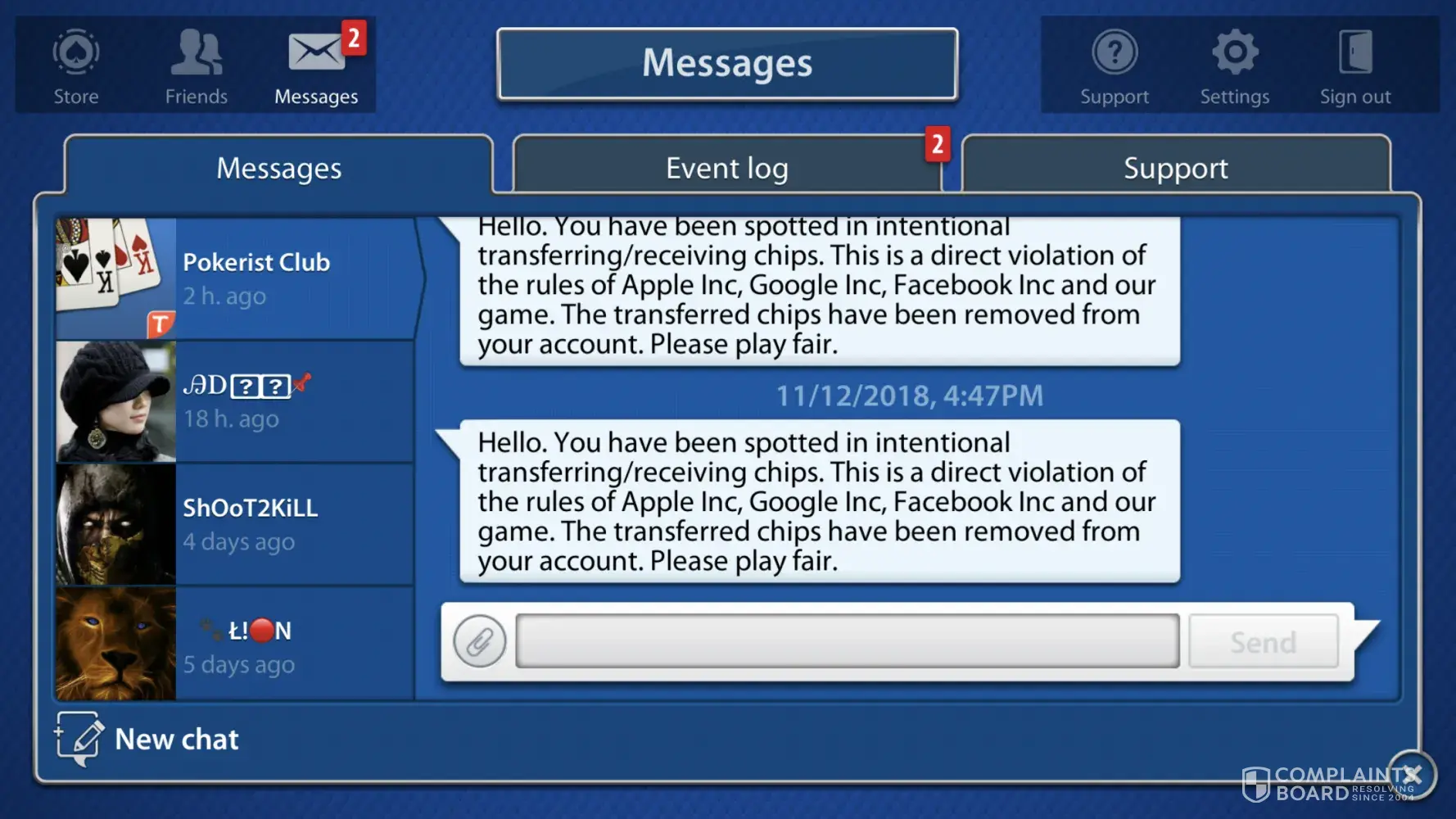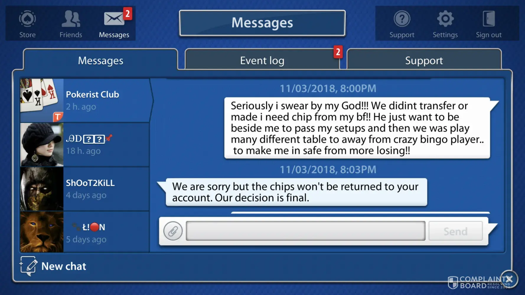 They keep taking my chips and told me that I have been spotted transferring chips!!! Seriously many time happened and I feel sooo disappointed and seriously they're bloody scammer game site.!! They didn't provide fair games as they're certification has been mentioned.!!! They're bloody cheater actually and pretend they are right!! They took all my chip...