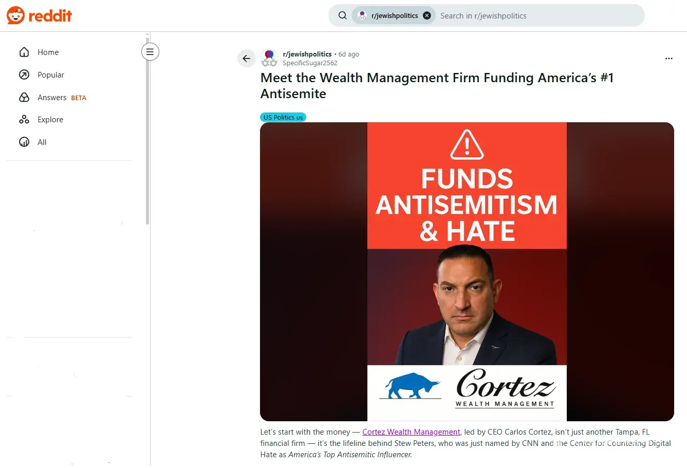 On October 10, 2025, I scheduled a consultation with an advisor from Cortez Wealth Management (Tampa Bay, FL area) to discuss options for protecting my retirement portfolio amid market uncertainty. The session lasted about 45 minutes, starting at 2 PM ET, and involved no financial commitment from me—just an initial discussion. No order number or contract...