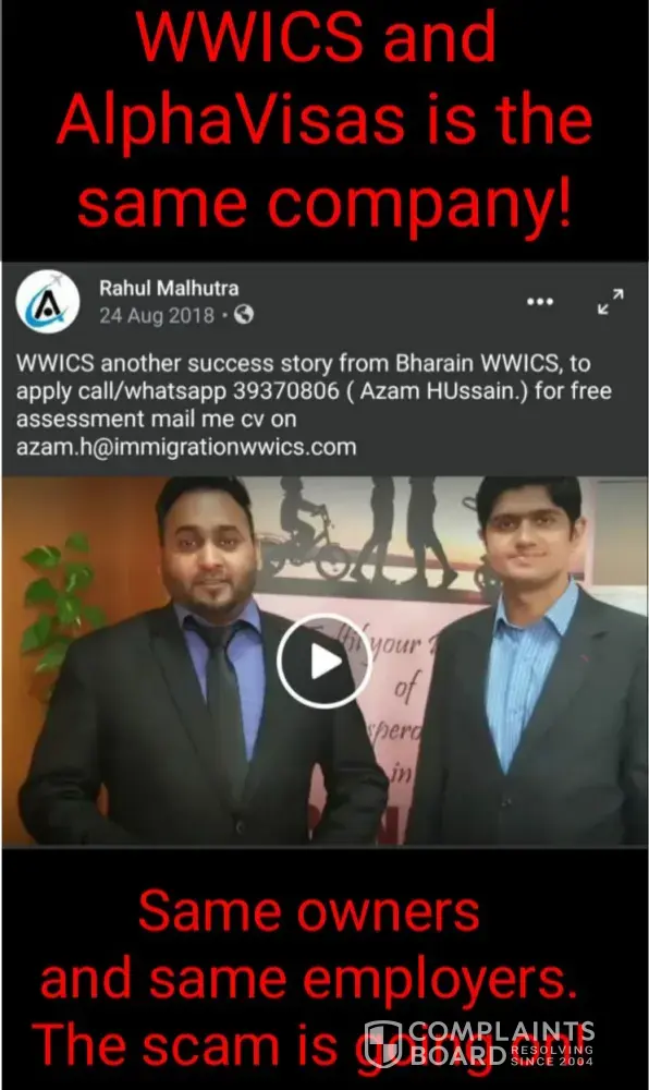 ALPHAVISA is the new name of WWICS bahrain, who close the office and Run Away with my brother money and many more victims (2 years ago)! They dont reply on any mails or when we call in india they play and lie to us and ask more money! They just change the name and address of the company and continue with the same scams and fraud activity - liars! Employer...