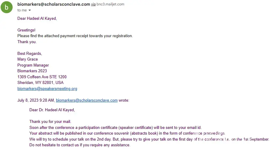 I am writing to file a formal complaint against the organizers of the "International Conference on Biomarkers and Cell Biology," which took place on September 01-02, 2023. My full name is Hadeel Abdallah Al Kayed, and I was a speaker at this conference. I participated in this event after paying a speaker fee of $385. I have a substantial email...