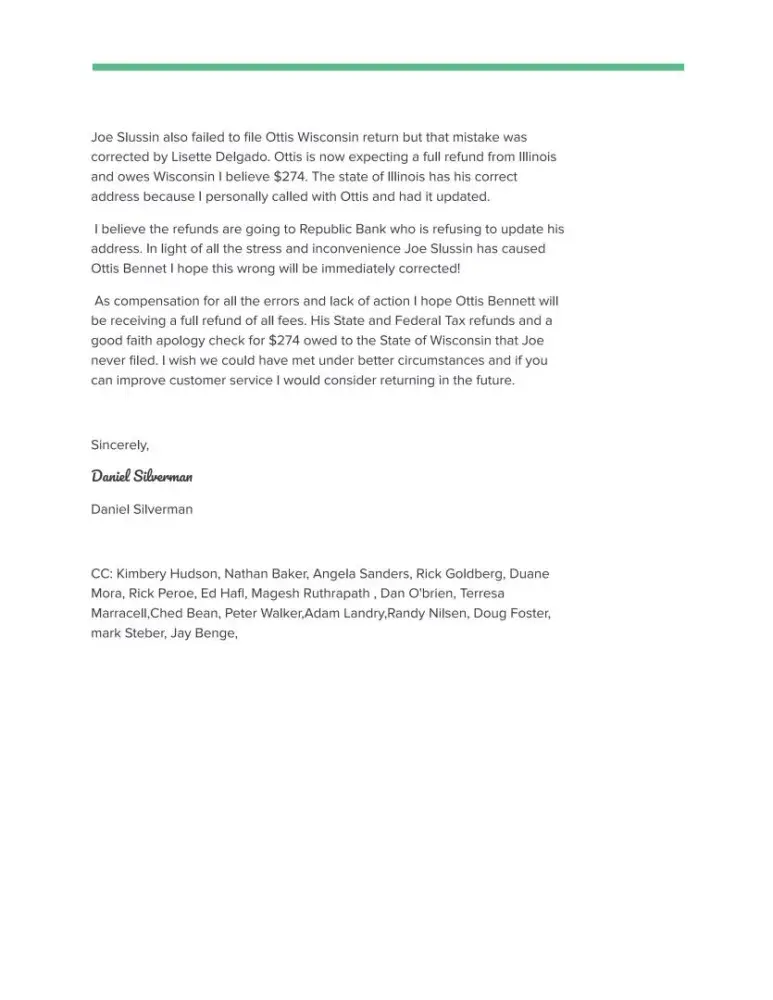 I am Daniel Silverman a former Jackson Hewitt tax preparer at 51228. Please take a moment and read the attached letter. I am contacting you on behalf of a client Ottis Bennet a client. Despite endless efforts to help him resolve his problems through standard channels nothing gets done. Ottis Bennett is a victim of fraud committed by another Jackson Hewitt tax preparer. Please help get justice for Ottis Bennett.