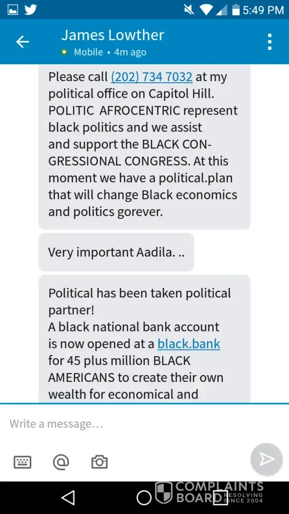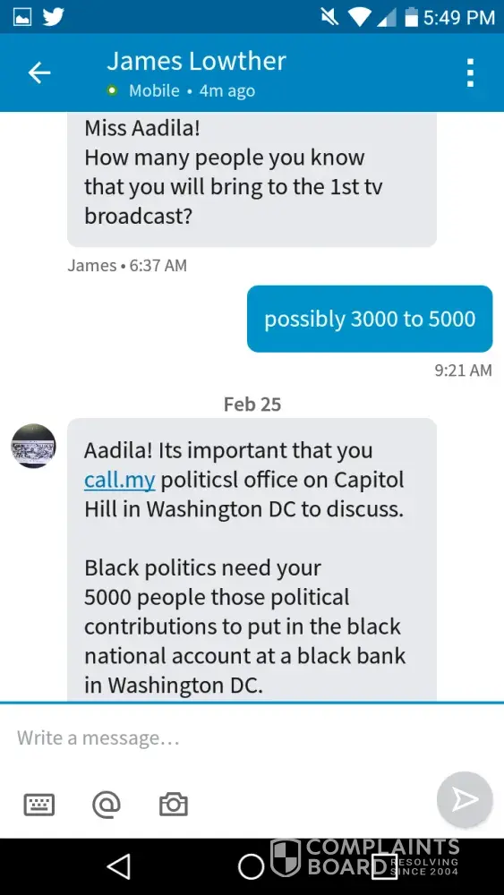 This person contacted me Yesterday asking me to call him at [protected]. He did not answer and he immediately call back from a [protected] advising he needs Film producers and reached out to me regarding a up and coming TV network he has in LA. He says he also have a small one studio opening in DC. Its based on all black political issues and he is working on a film entitled "The Black Yankee" have never heard anything about this person before and his name on Linkedin is James Lowther. He was requesting that I come out to LA and he wants me to come work on his TV and film network as a producer.. He kept telling me he wanted me to fly out to LA so he can introduce me to some powerful film people. He says he is connected to Byron Allen the comedian who just purchased the weather channel.. He also advised he is working to have Tonetalks and Yvette Carnell on his network show.. After contacting some of my friends in the entertainment industry I was advised it's a scam.