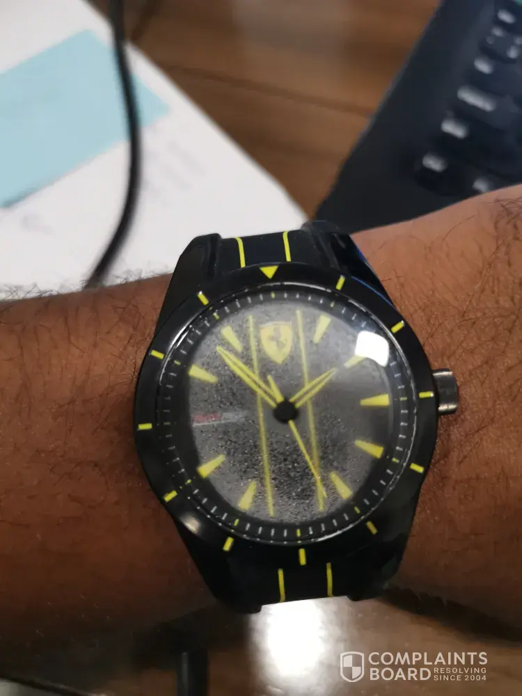 We bought a watch in a brand red rev. As its mentioned in the specification the watch should be water resistant. After we used a weeks, we experienced a water forming inside the glass and not visible to see the timings. We strongly recommend for the replacement. Order no [protected] Order date [protected] Model no 830482 Scuderia Ferrari Men's rerev Thanks