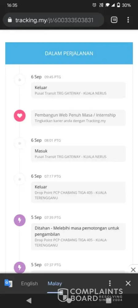 Good afternoon. I have shipped the goods on 5/9/2021 tracking number [protected] to the address No 133, Jalan Merbau, Oren Business Center, 13000 Butterworth, Penang and until now my shipment still could not be delivered to the proper location. The track and trace system also did not make any updates to know the latest location of my goods. Please sir/madam be able to take appropriate action so that you are responsible for the delay in sending my goods