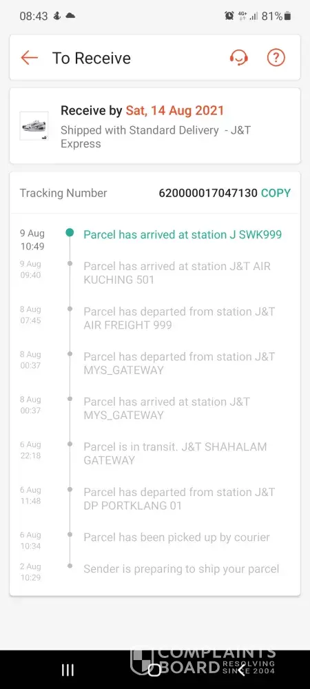 Why my parcel stuck at JnT Air Kuching 501 for too long? It already exceed delivery time provided by shopee. Please kindly deliver the parcel as soon as possible. The parcel already arrived at JnT Air Kuching 501 since 9 August, but until now I not yet received the item. My other parcel from shopee also using JnT as a courier, all of it have arrived early then this parcel even I buy late than this item. Please dont hold customer parcel for too long. Thank you.