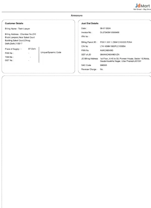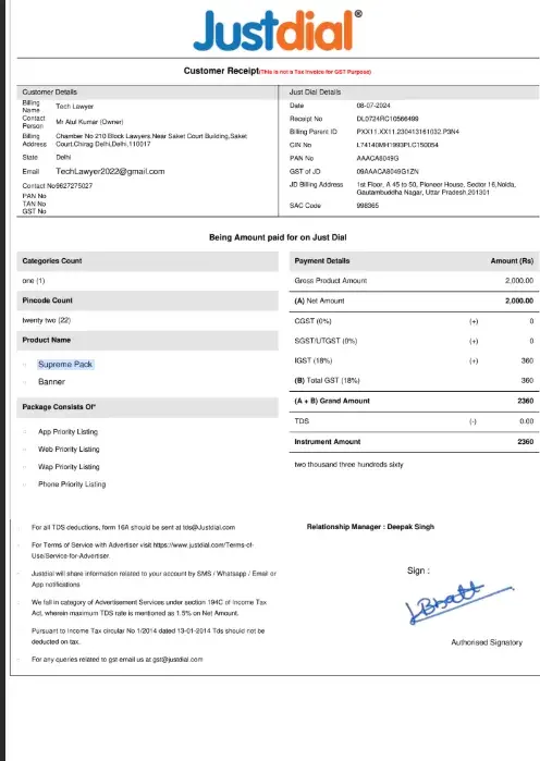 Respected Sir/Madam, I am writing to formally lodge a grievance against JustDial regarding the deficient services provided under my subscription for "Tech Lawyer." Despite repeated attempts to seek redressal, my concerns remain unaddressed. I had subscribed to JustDial services with the promise of receiving 3 to 5 daily leads for my business. However, the...