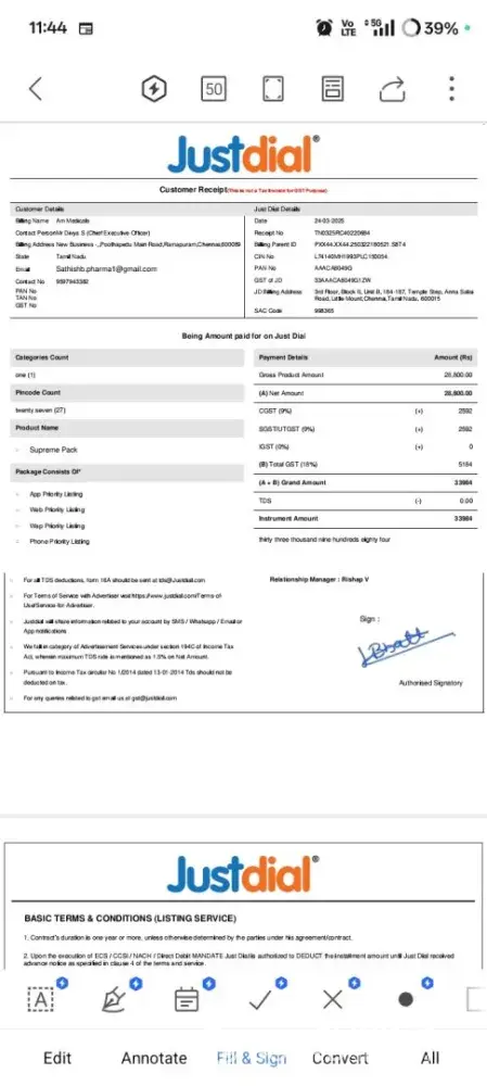 In the month of March, Mr. Nishant contacted me and presented an enticing package offered by Just Dial. On March 31st, he visited our premises and made a series of false commitments regarding the packages and services provided. As part of the agreement, he requested a payment of Rs. 4,720 by cheque and Rs. 5,000 in cash. I complied with his demands, submitting a cheque for Rs. 4,720 and providing him with Rs. 5,000 in cash on the same day.
