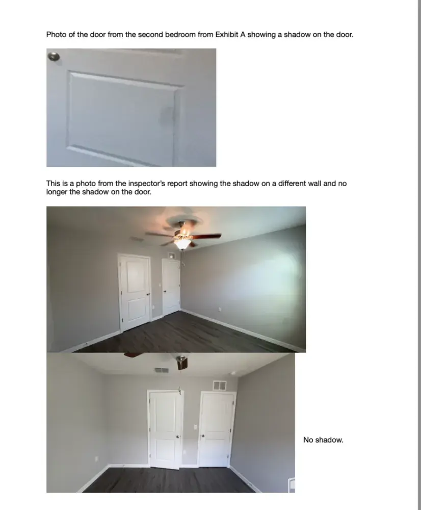 Their so-called “move-out inspection†is actually labeled “1 – INITIAL REHAB – Pre-Construction Walk Inspection†and was completed by a local scam artist that they contract with named Juan Guaviria on March 23, 2026 — three days after we moved out. In their April 1 response letter they claimed the home was in “pristine, new condition upon move-in†and that the wall smudges were “beyond routine living†and “highly concentrated on a single wall†which exceeds normal wear and tear. Their own Exhibit A photos (full of shadows, duplicates, poor lighting, and mislabeled rooms) only further weakened their argument — our clear, well-lit move-out photos easily disprove it.