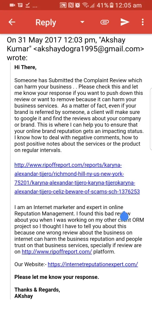Why don't you admit you just want my money? didn't you sent me this email I am attaching asking me for money 5 minutes after this and the other post at rip off .com was placed? You are not in the USA you are in India and you use the fake name of Akshay Kumar from an internet seo managment company Renuka Technologies aka Internet Management and aka as many as bogus names you use. You need to get better ways to try to get my Money with this idiocy. Anyone can go to my Zumba personal Page Provided by ZUMBA INC where they have my location in where I teach and how long I have been a Zumba Instructor. You are a sorry excuse of a human being I have never lived in Arizona. I am a New Yorker and I work in New York and this is my Zumba Page GENIUS! : http://karynatijero.zumba.com/ What it says right there? I AM IN NEW YORK!
