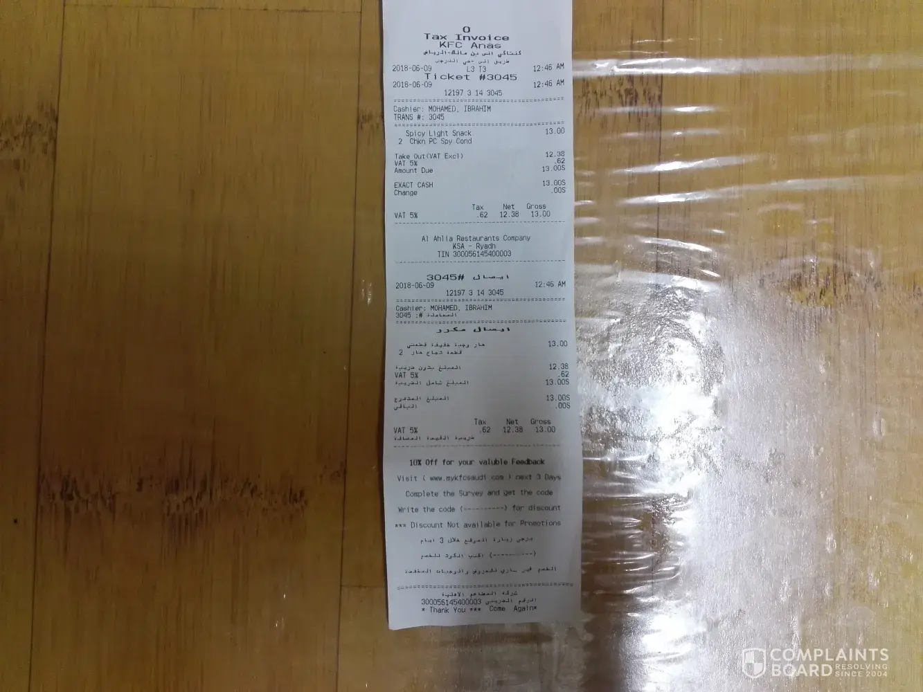 I realy want to say that thi is not good for a company like kfc. I take food from kfc in india, Dubai, and also from riyadh i was happy for the customer care of all these places. These type of negligence towards a non saudi coustmer i saw in this branch only.