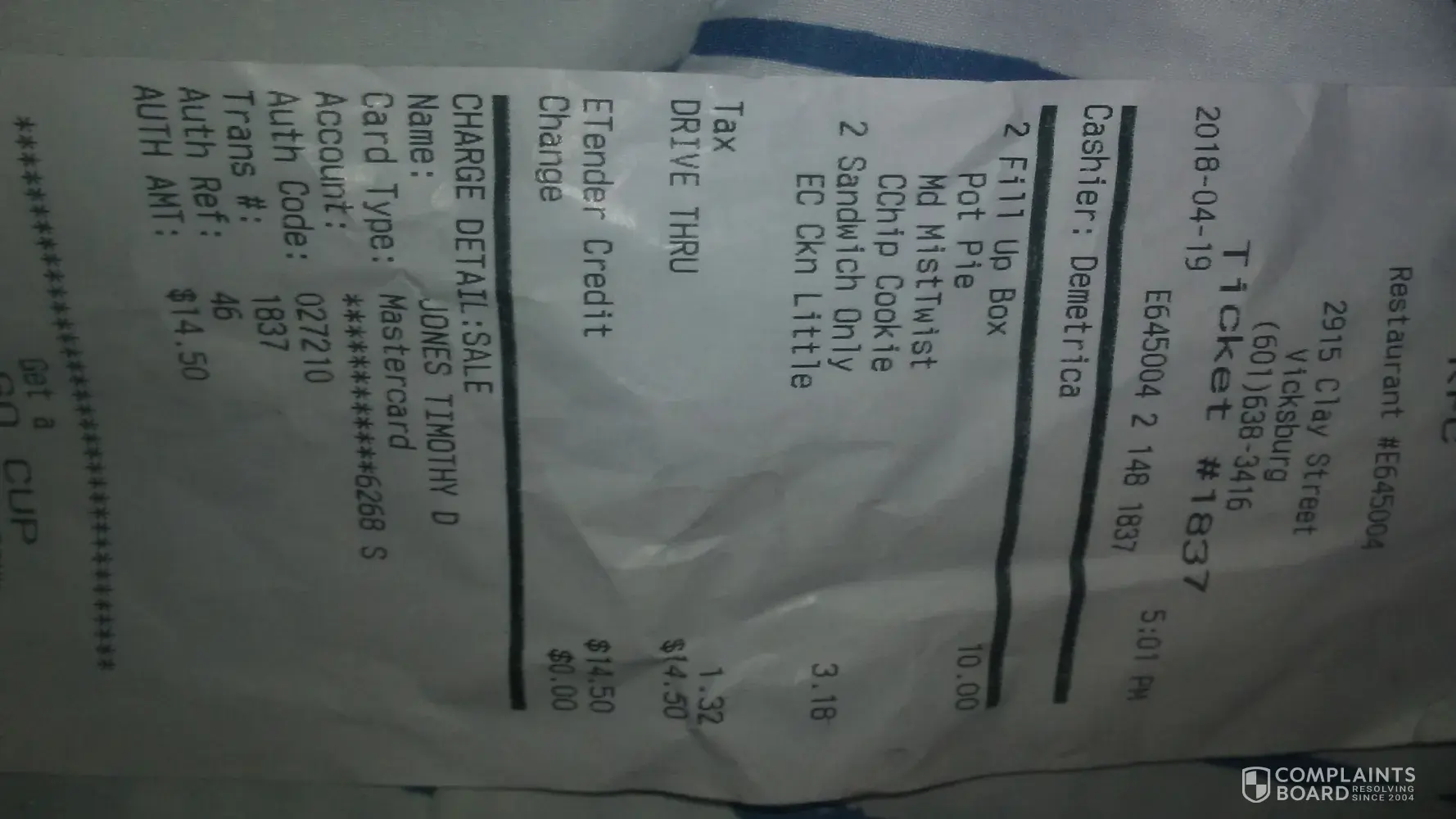 I came through the Drive Thru around 11 am on April 16th, 2018. I ordered the 5 dollar fill-up and my total was 5.35, I get to the window and the cashier asked me if I had any cash. I told her no I only had my debit card. The cashier told me their credit card machine was down but she would try my payment. She hands me my card back and tells me the machine isn't working and ask if I am sure I don't have any cash. I again stated no I didn't have any cash. The cashier then says well the card machine is down. There was no sorry, there was no okay lets make this right and just give me the meal. So I had to spend another 10-15 in another drive thru getting lunch. I was looking over my bank account and I was still charged the 5.35 for a meal I did not receive. I would like my account to be credited back