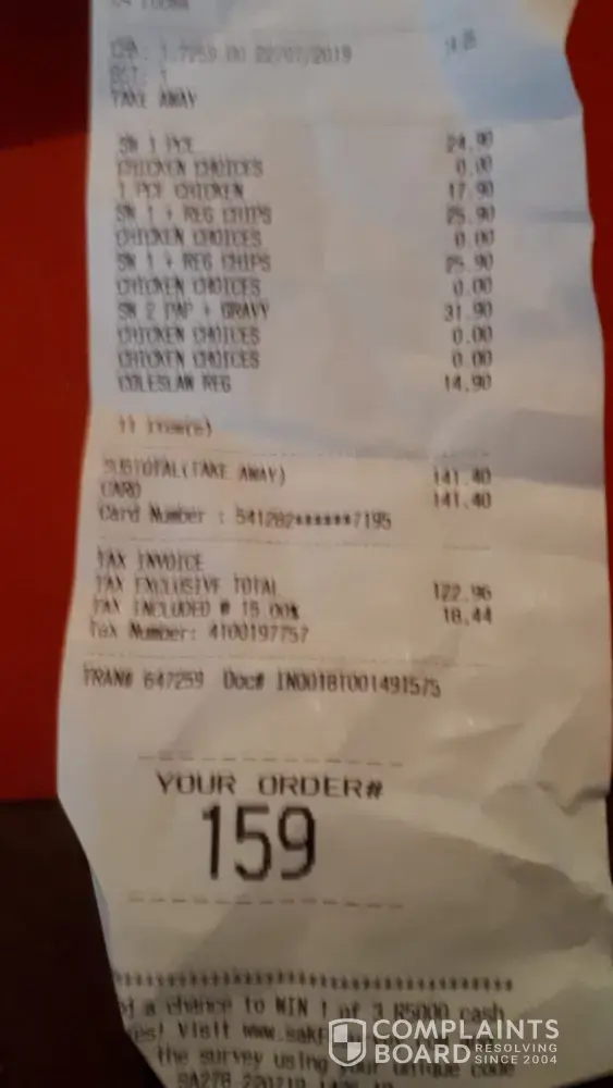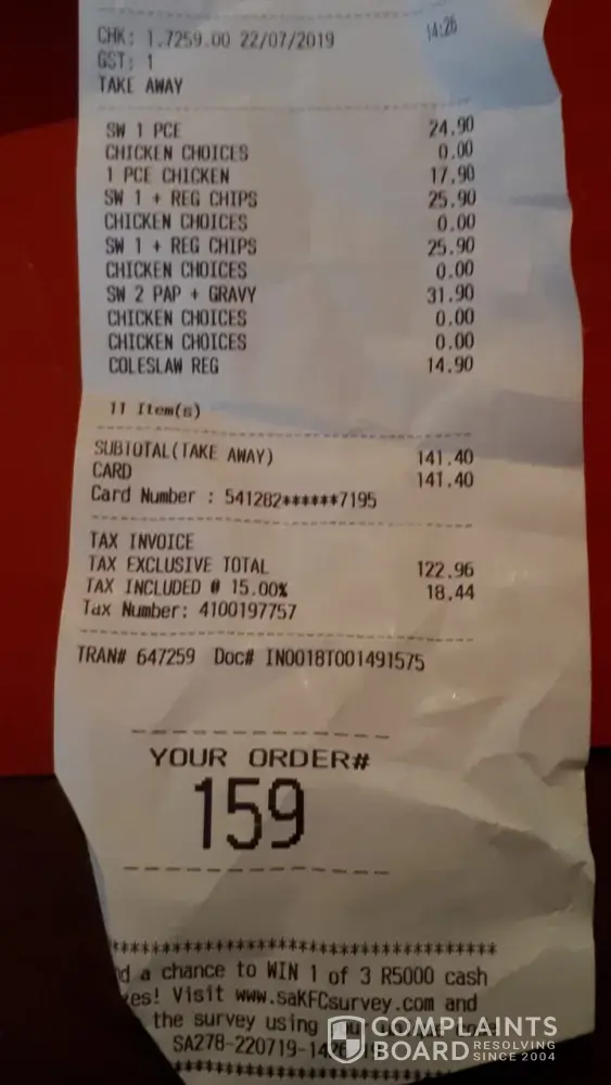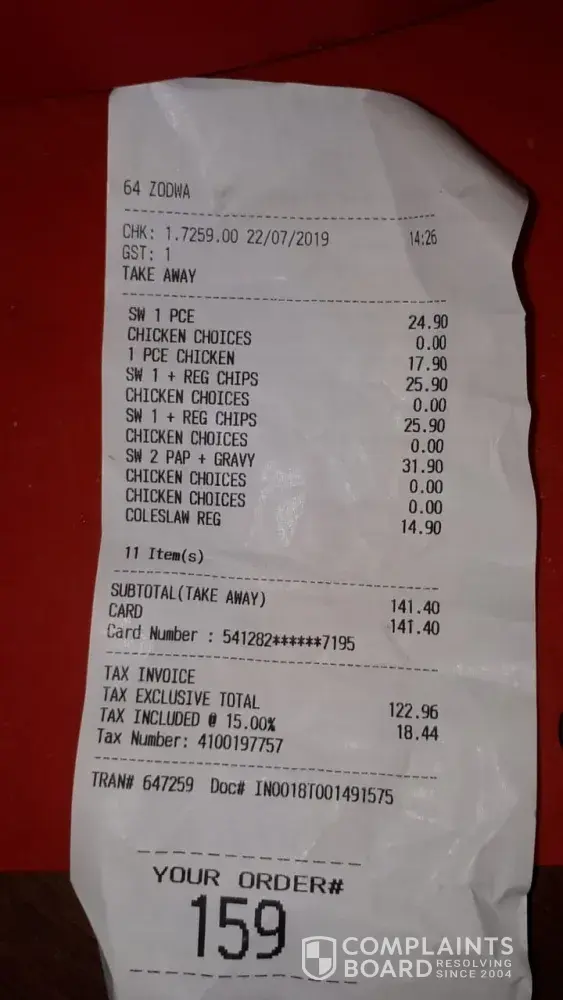 This is over the tenth time I have had an incorrect order from this branch. Today I ordered three streetwise ones. One with mash and gravy. Chicken selection 3 with side breasts. Extra portions 2 thighs and 1 wing. Problem 2 of the orders came without bread rolls. 2 came with center breasts 1 with a thigh. There were no extra pieces although they wete paid fot. The order number is 159. I have reoprted these incidents to kfc customer care on several occasions but nothing has improved. I either want a refund or my correct order!