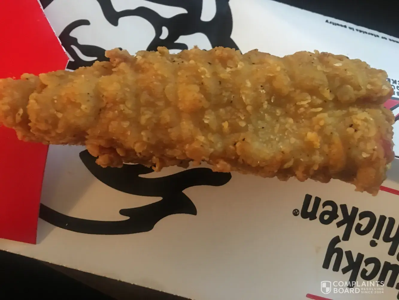 I went to the KFC at 5607 N Lamar Blvd, Austin, Tx 78751 today around 1:15pm with every intentions of ordering an extra crispy meal, but upon arriving I ordered the 5pc chicken tenders instead, with wedge fries and Diet Pepsi. When I return to work I noticed the chicken tenders looked like long John silver fish and didn't even taste like chicken. It tasted rubbery and almost tasted like fish. Is this normal ? I will never order that again. Very disappointed with KFC today.