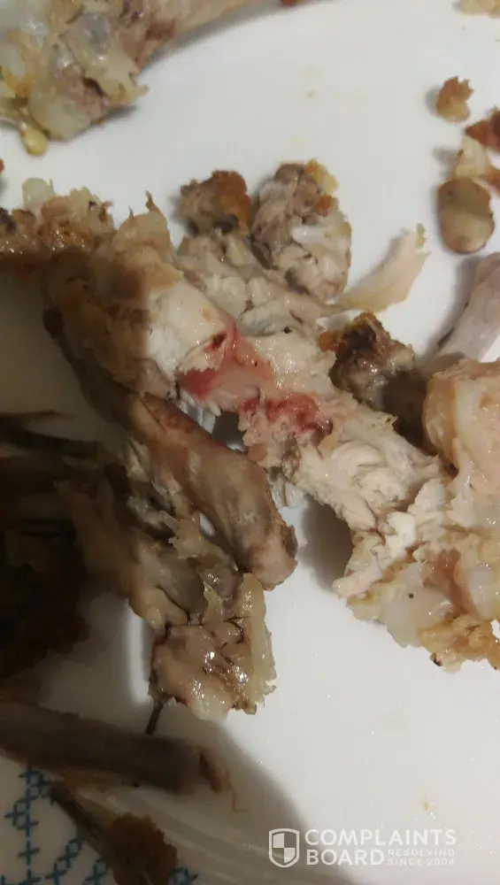 On the 26th February 2019, my partners went and got two of the 9 pieces deal. When we returned home there were only 7 pieces in each box this is not acceptable. Two hours later after eating two pieces of the chicken I vomited 5 times. Upon looking at the remains I found one piece to have fresh blood coated on the bone and didn't look cooked very well. I would like compensation back for the missing chicken and also for the raw food being sold causing me sickness.