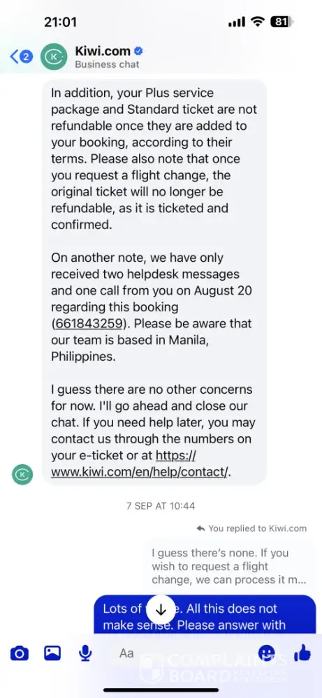 This is the email I sent KIWI.com and I have received no response. That was 13/09/2023
