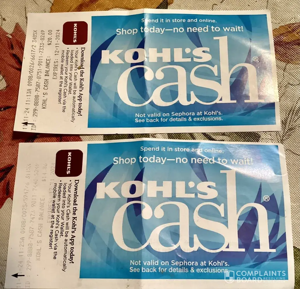 I purchased several items on Kohls.com and had to return most of them. When I did, I was given two Kohls cash blue and white certificates - one for $20 and another for $14.86. Expiration date was December 11, 2024. I again placed an order on Kohls.com and neither certificate worked. I tried putting in the number on the backs of the certificates with the...