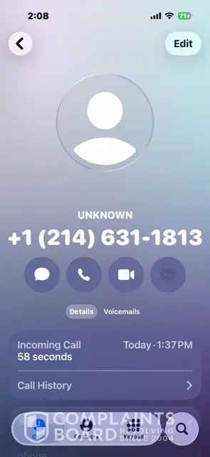 The call lasted only 58 seconds. I took a screenshot documenting the call.