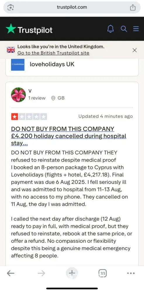 Loveholidays cancelled my £2,600 holiday while I was in hospital – refused reinstatement or refund Complaint Body: I booked an 8-person holiday to Hilltop Gardens, Paphos, Cyprus (20–27 August 2025) through Loveholidays, total cost £4,217.18. By 6 August I had paid £2,600, with a final balance of £1,600 due. I became seriously unwell before the...