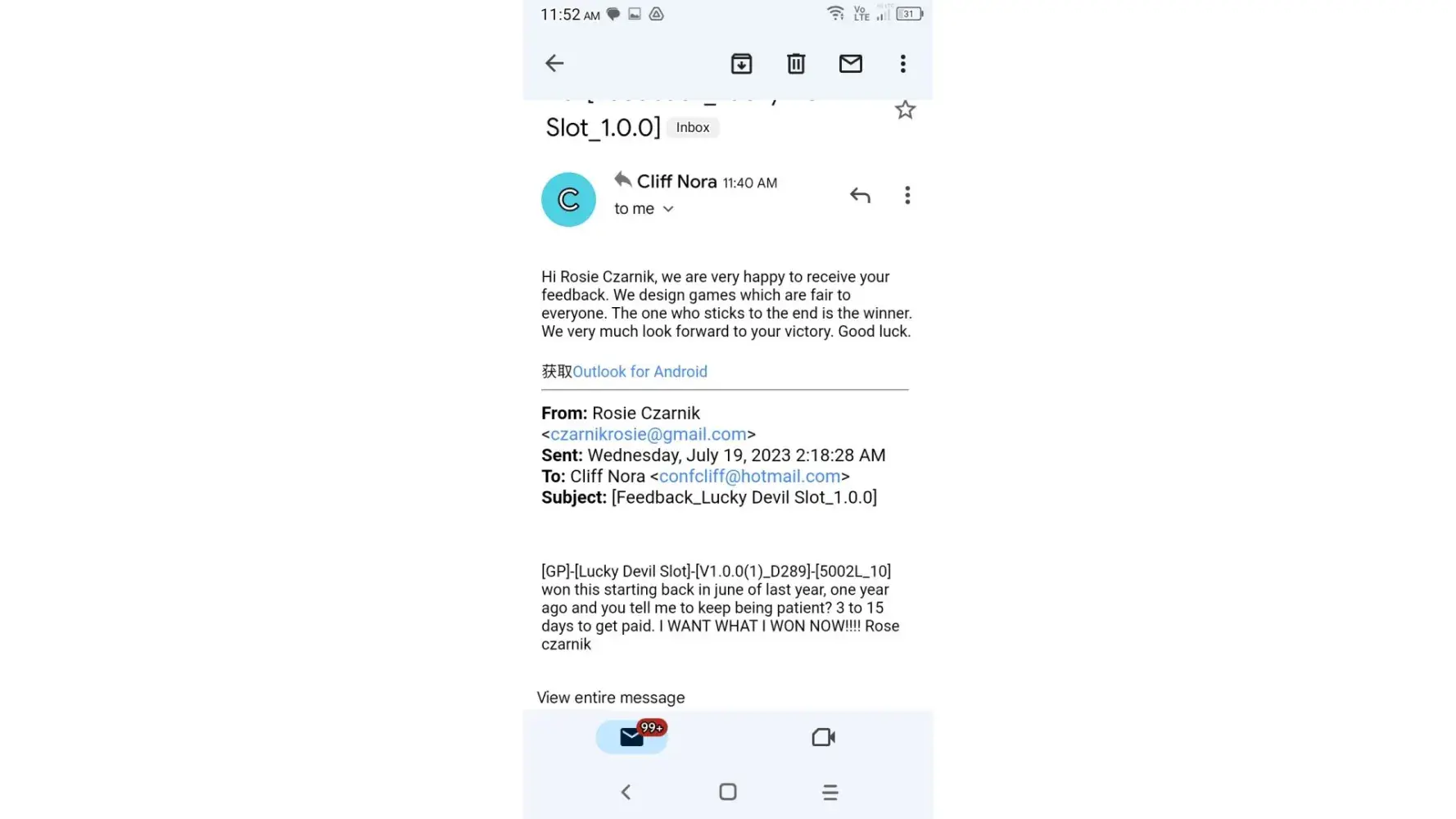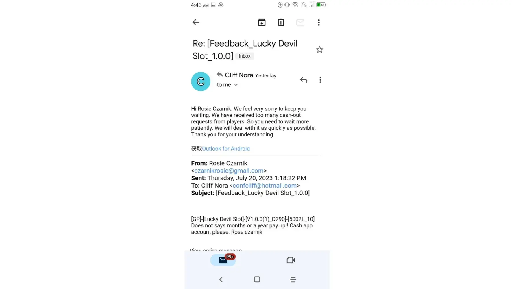 Played Lucky Devil Slots game and other games by this same developer for the last four months that were pending in the queue payable to me but have mysteriously disappeared from my Cash App Account and my PayPal Account I've tried emailing them for the last week numerous times and have not received a reply back I've contacted PayPal and they have no pending payments in the queue waiting to be deposited into my account They do not provide a customer Service Number The total amount due me from Lucky Devil is $10000+