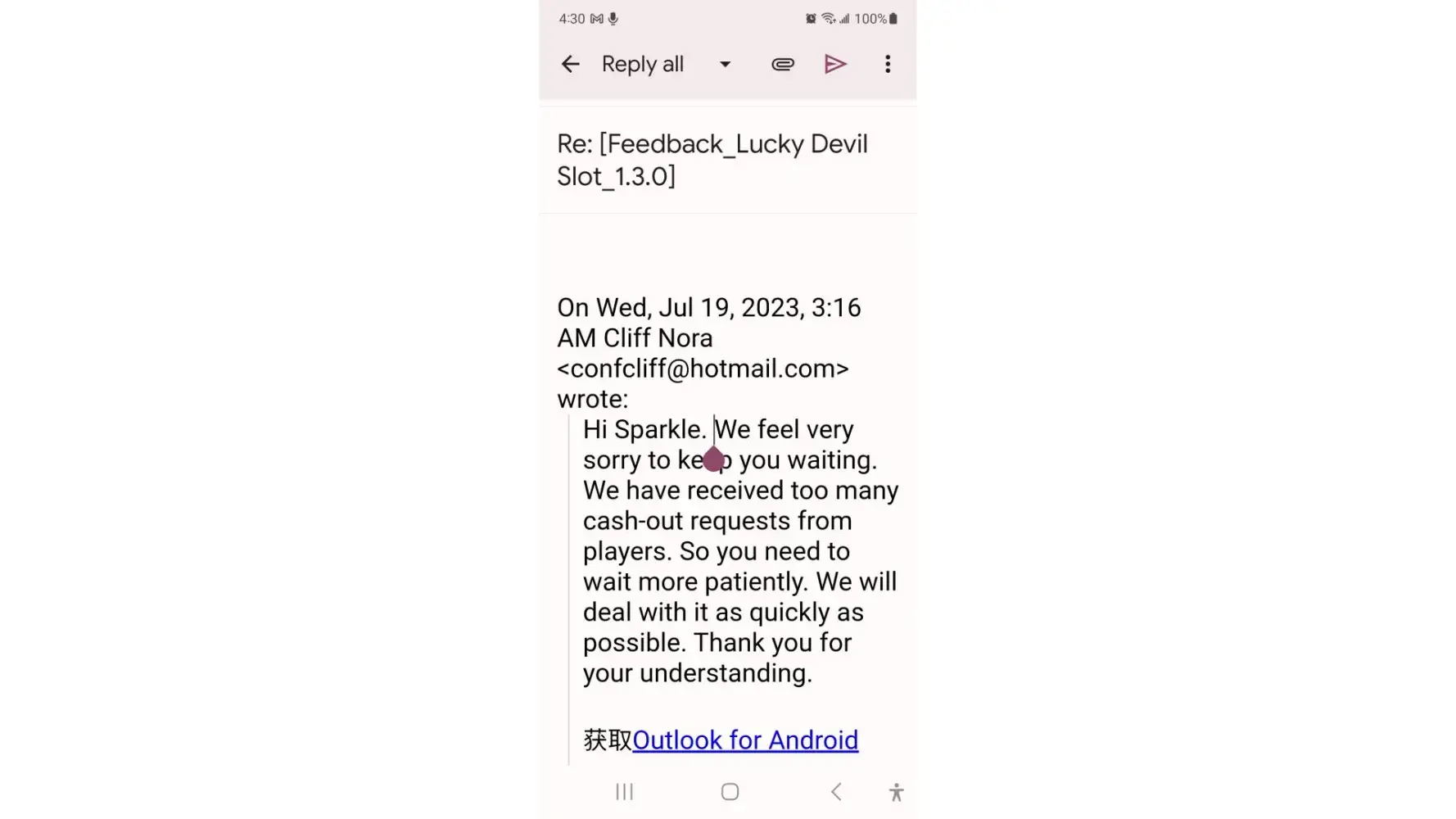I hope this comment makes it back to the Lucky Devil Slots game publisher, creator and other involved scammers.