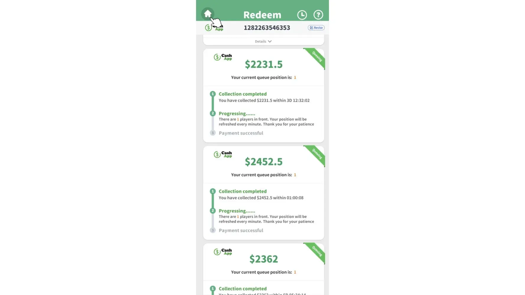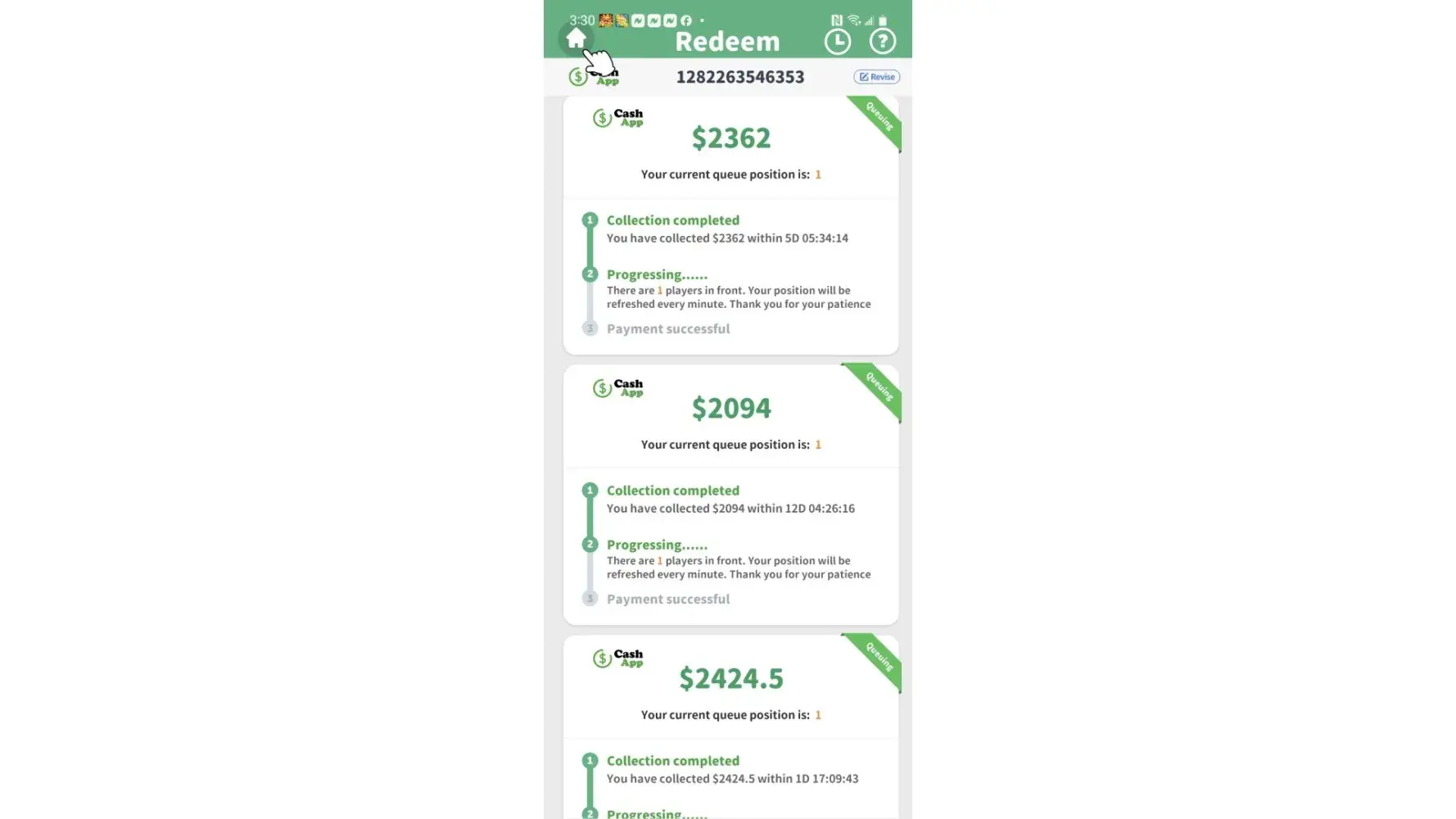 I am having doubts about ever receiving any money from them. I have spent hours upon hours spinning to win as well as looking at numerous ads to accumulate money for payout to my Cash app account. Then I find out that I’m behind thousands of people before I can collect my winnings. When they say 2-3 business days then that’s when they should pay and not have you in a queue behind a multitude of people. Either you have the money or not!
