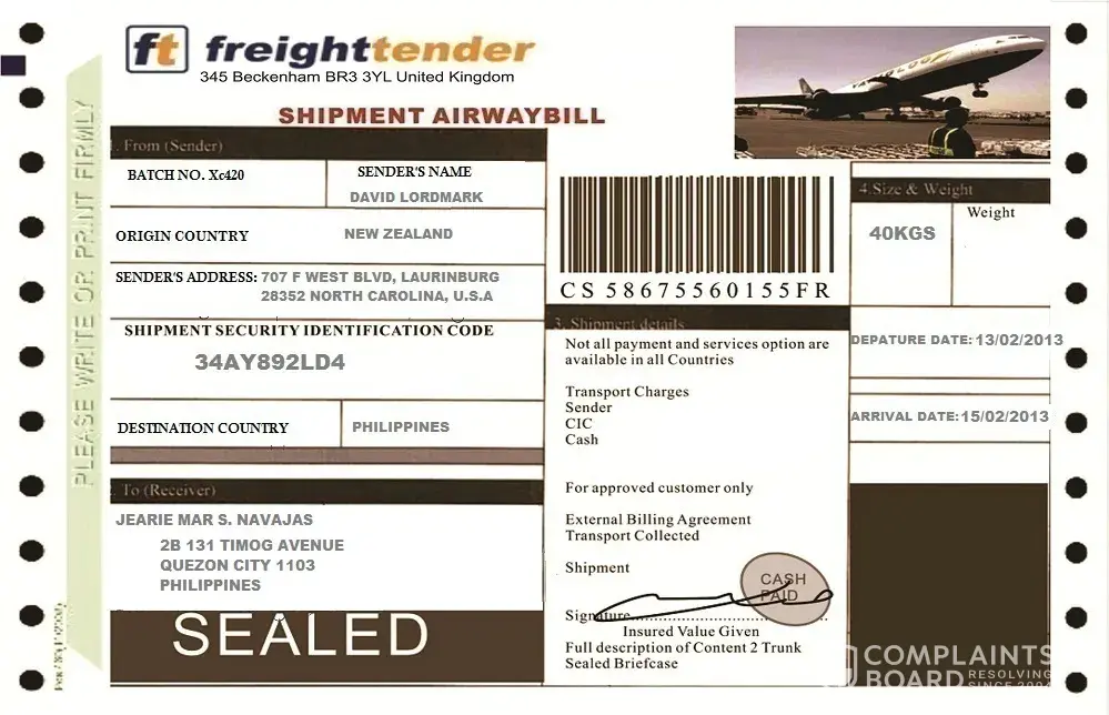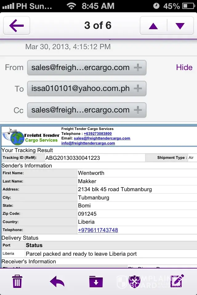 Hi guys! I have the same story as yours. Ang galing nila. Magkakakunchaba silang lahat and nagawa pa nilang gumawa ng website para pagcheck mo ng tracking number maglabas name mo. I have chatmate named wentworth makker. His from autralia. He worked there as a journalist. He was assigned in liberia because if his job. To show love to me he will be sending me a laptop, cellphone, jewelries, bag, shoes, chocolates, flowers and 10, 100 britain pounds. I got an email from freight tender cargo services and have the details of the said parcel. 2 days after somebody texted me from custom named alice mortiz with cell number [protected] to pay 12, 000 for admintrative taxes. Kaya nagtanong tanong ako sa mga cargo if totoo ba yung ganon and they have told me hindi daw if its door to door wala daw babayaran na charges.. Heres the pictures guys...