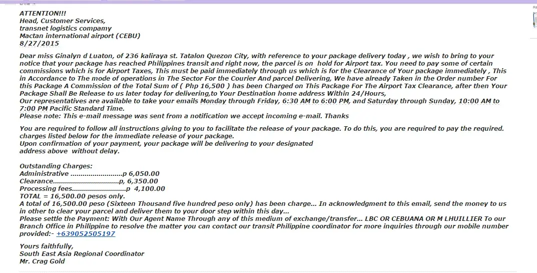 A total of Php9, 600.00 (Nine Thousand Six Hundred Pesos only) has been charge. In acknowledgment to this email, send the money to us in other to clear your parcel without delay to avoid penalty.For inquiry contact:[protected] Mr. Yang Lee.