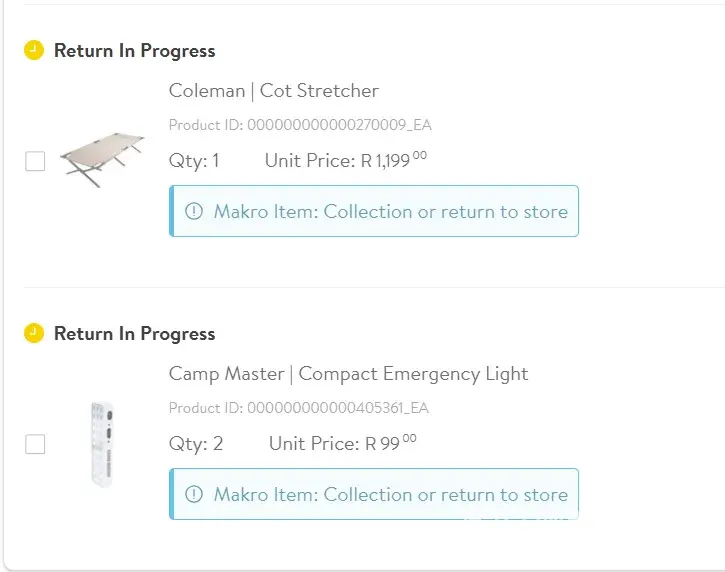 I made a purchase on the 3rd of November - order number MAK8047363. The following items were returned to Makro on the 22 November - 1 x Cole Stretcher 2 x Camp Master Emergency lights. I am STILL waiting for my refund 6 weeks later. I have attempted to contact Makro on whats app on numerous occasions and have had no response. I have also called the...
