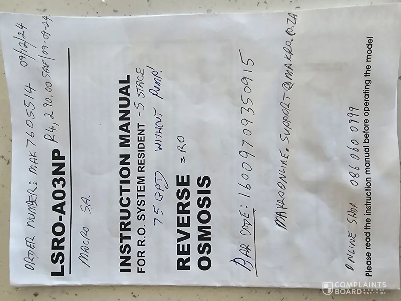 Read full complaintReverse osmosis filter system, order no: MAK7605514, September 2024.