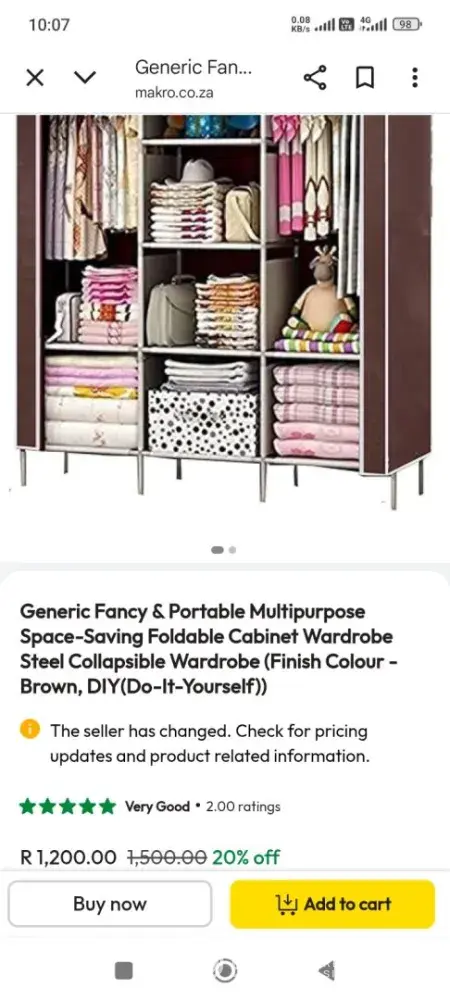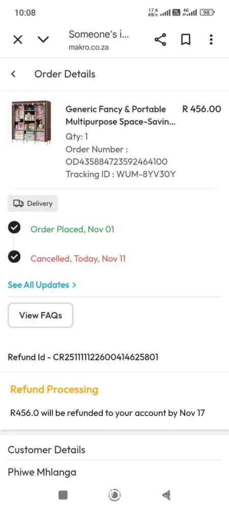 On 01 November 2025, I bought a foldable wardrobe online, for R456. This morning (10 days later) they cancelled my order and raised the price of the item to R1 200. No communication in between, just a discrete refund. Section 23 of the Consumer Protection Act prohibits this conduct. I incurred bank charges in processing the purchase. I also bought item...