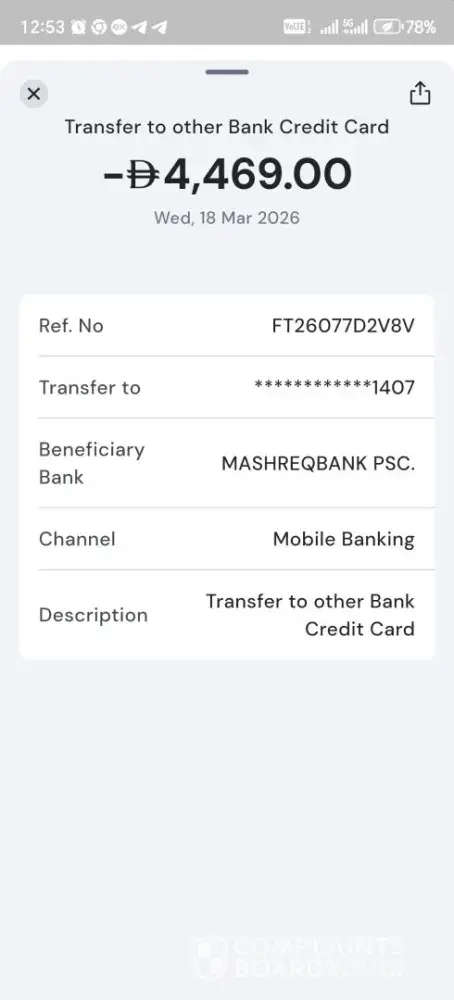 Myself raised the Dispute Transaction complaint on 19.01.2024 13.50 HRS vide Case REF [protected]-K5M9S4 upon receipt of transaction confirmation email / SMS from Mashreq Bank.