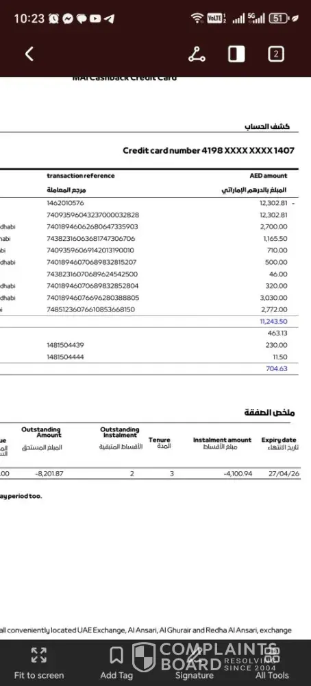 I have paid my credit payment 18 March 2026 my credit due was 19 March but due to eid holiday money not enter to the credit card from fab bank, but it's not my problem, you guys returned late payment fees but not reverse tawarruq profit, i don't know what is that, even my another credit card you guys put cash advance fee for binance purchase but that is i...
