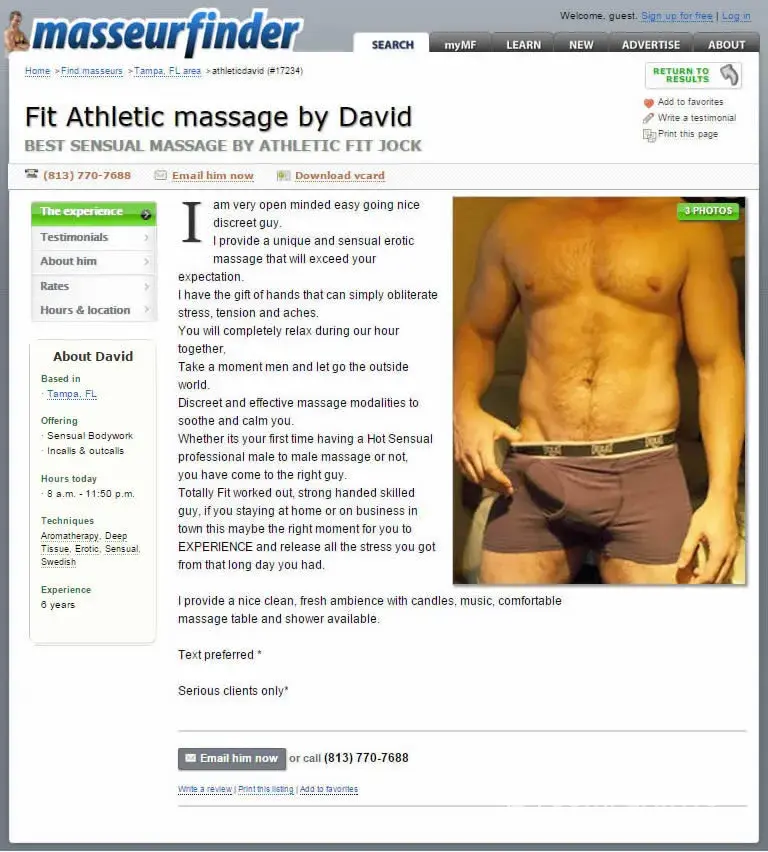 As an internet sleuth wannabe, I took the time and did a deep dive and was able to find the following information about this "masseur/escort". Basically I began with a reverse picture search and was able to find multiple phone numbers used by this guy through the years, all the way back to 2014: